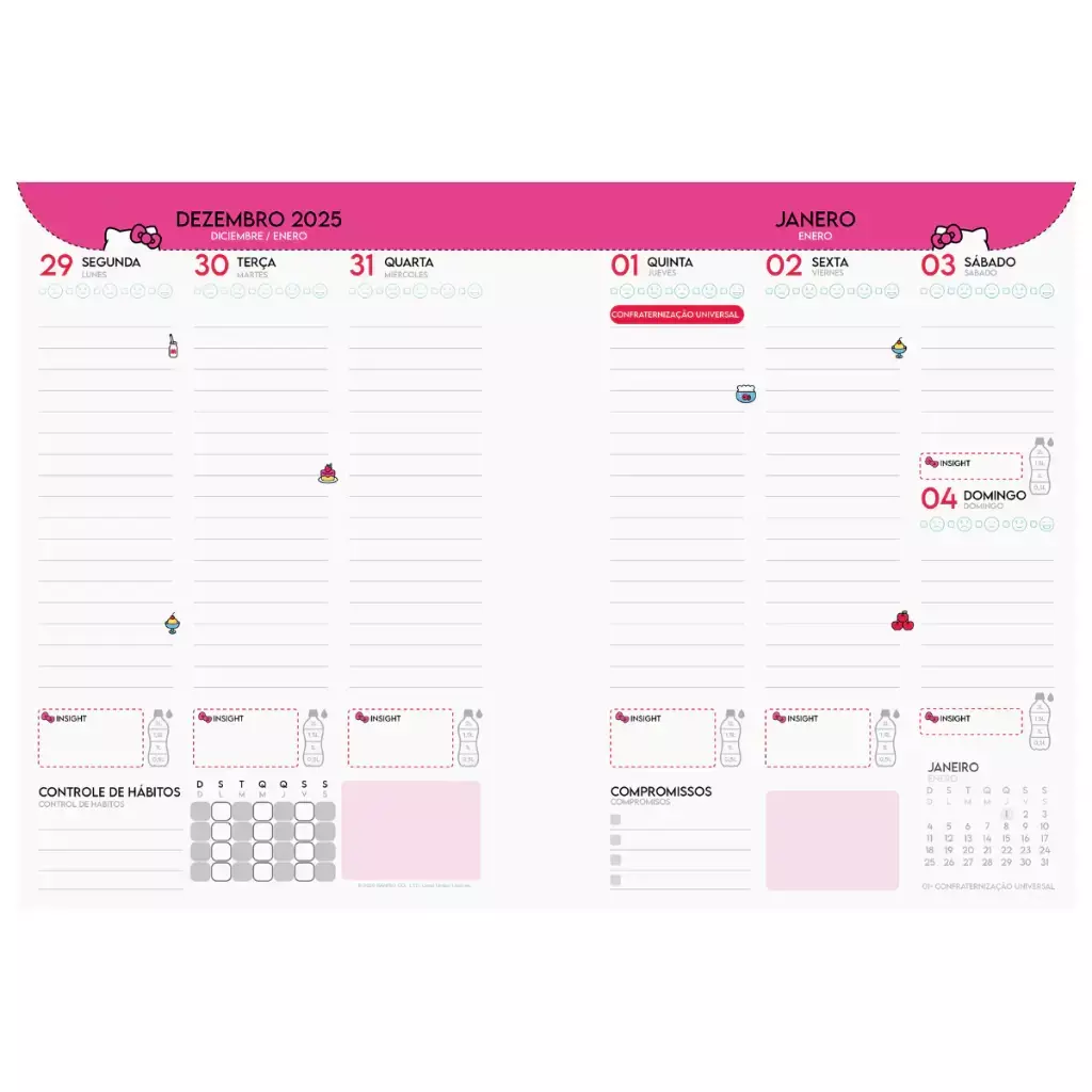 AGENDA PLANNER 2026 HELLO KITTY, O ITEM PERFEITO PARA QUEM BUSCA ORGANIZAÇÃO E ESTILO. COM CAPA DURA E ESPIRAL É PRATICA E RESISTENTE. FABRICADA PELA JANDAIA, RENOMADA MARCA DO MERCADO, GARANTE QUALIDADE E DURABILIDADE. COM 160 PÁGINAS DATADAS TEM O TAMANHO 175x242mm, PERFEITO PARA LEVAR NA SUA BOLSA OU MOCHILA, SENDO ASSIM IDEAL PARA SE PLANEJAR COM MUITA PRATICIDADE E ESTILO.